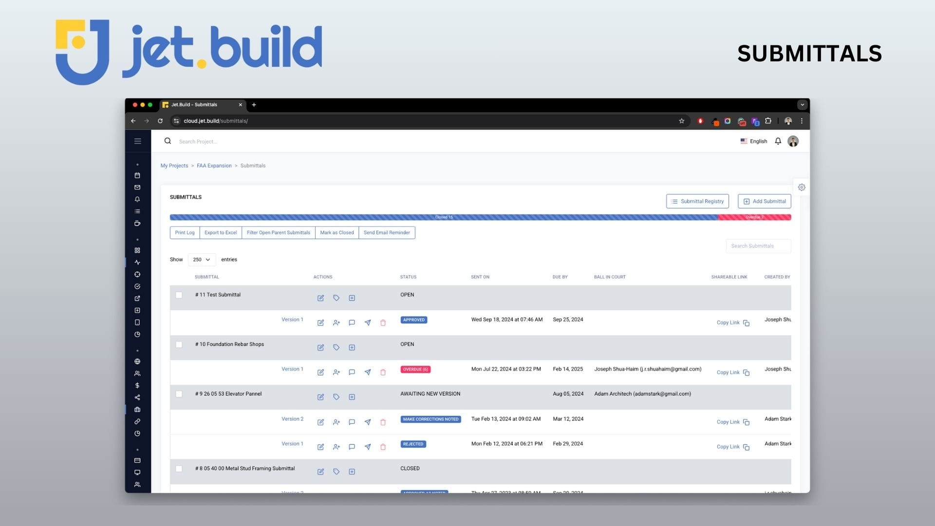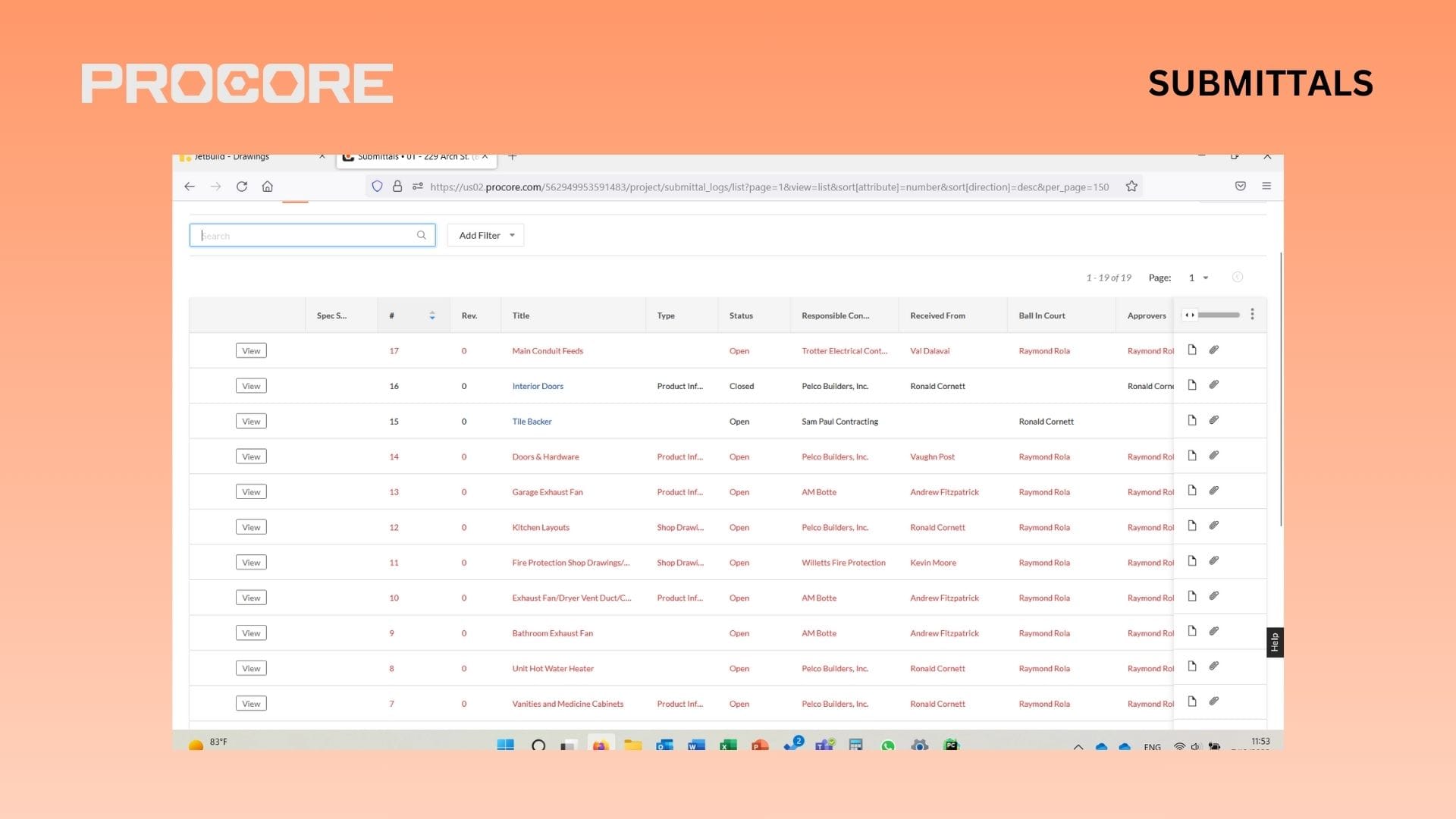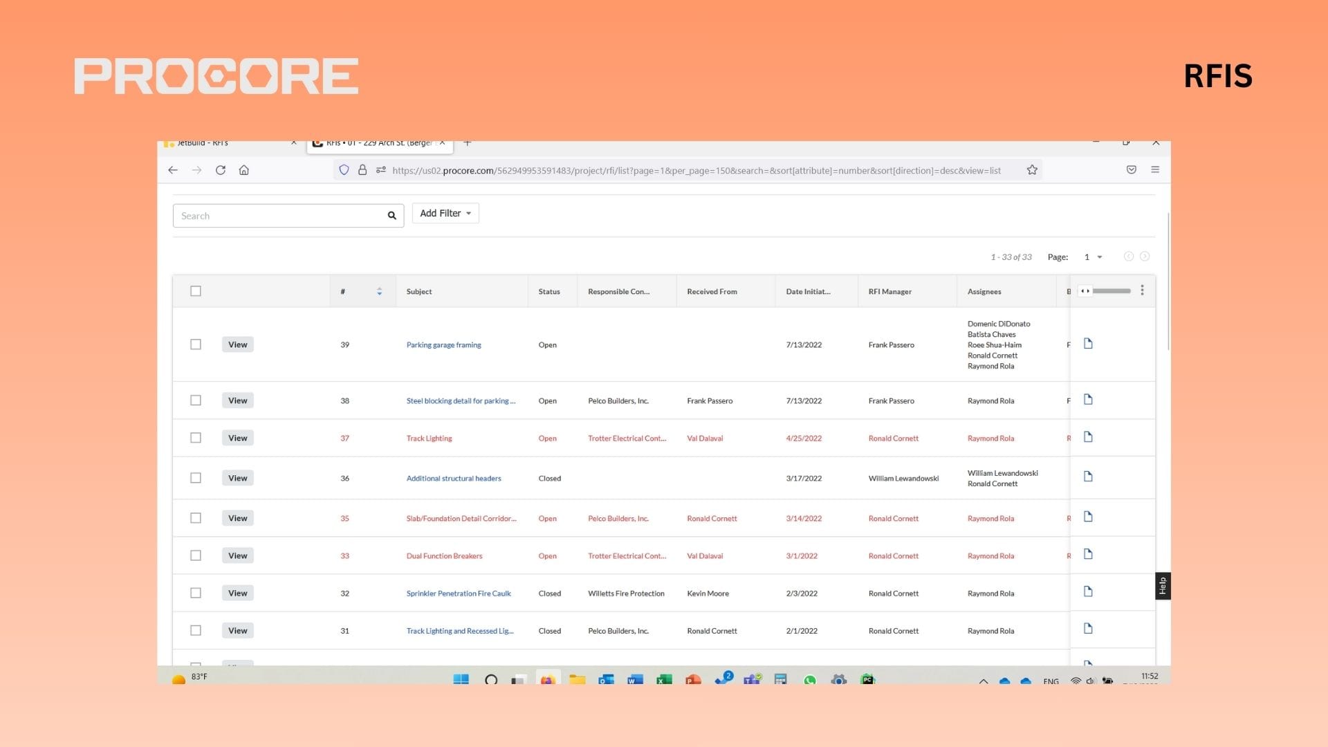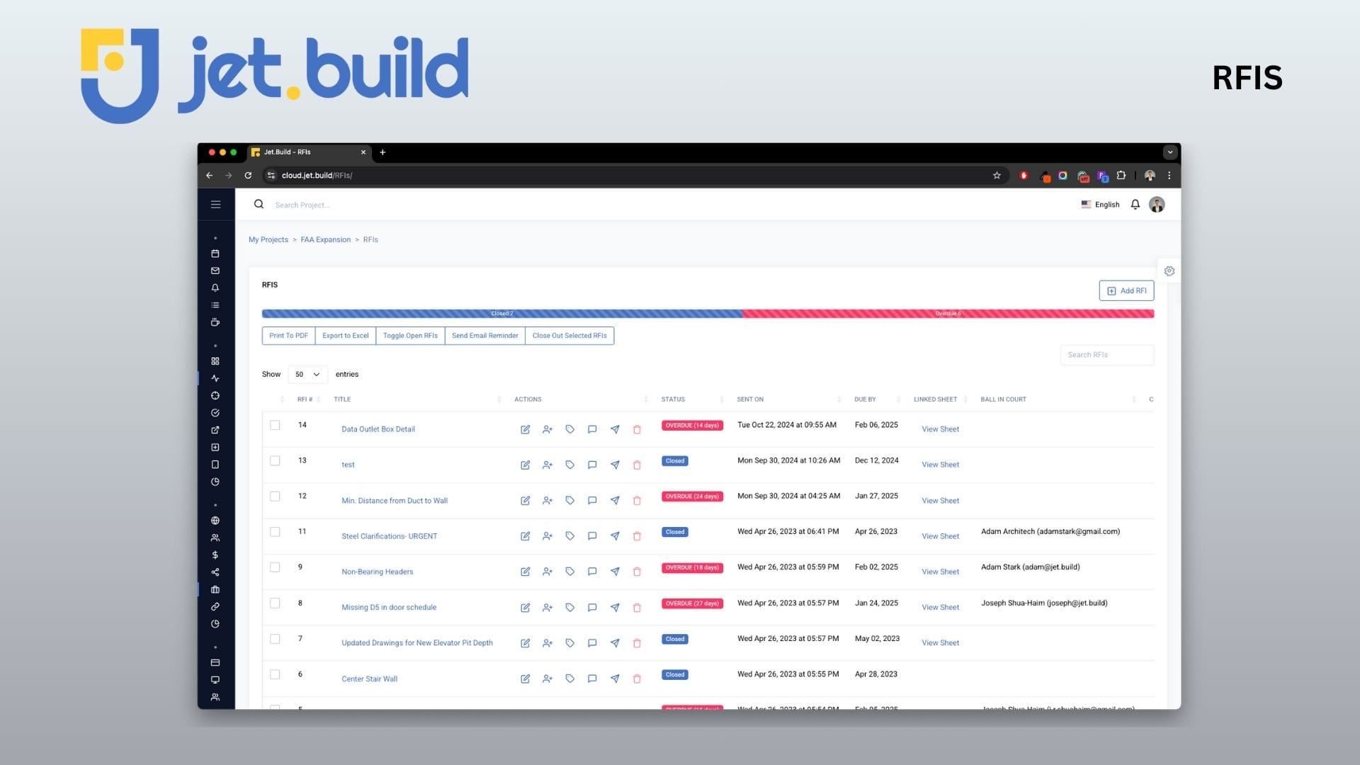 - RFIs, submittals, daily reports, inspections